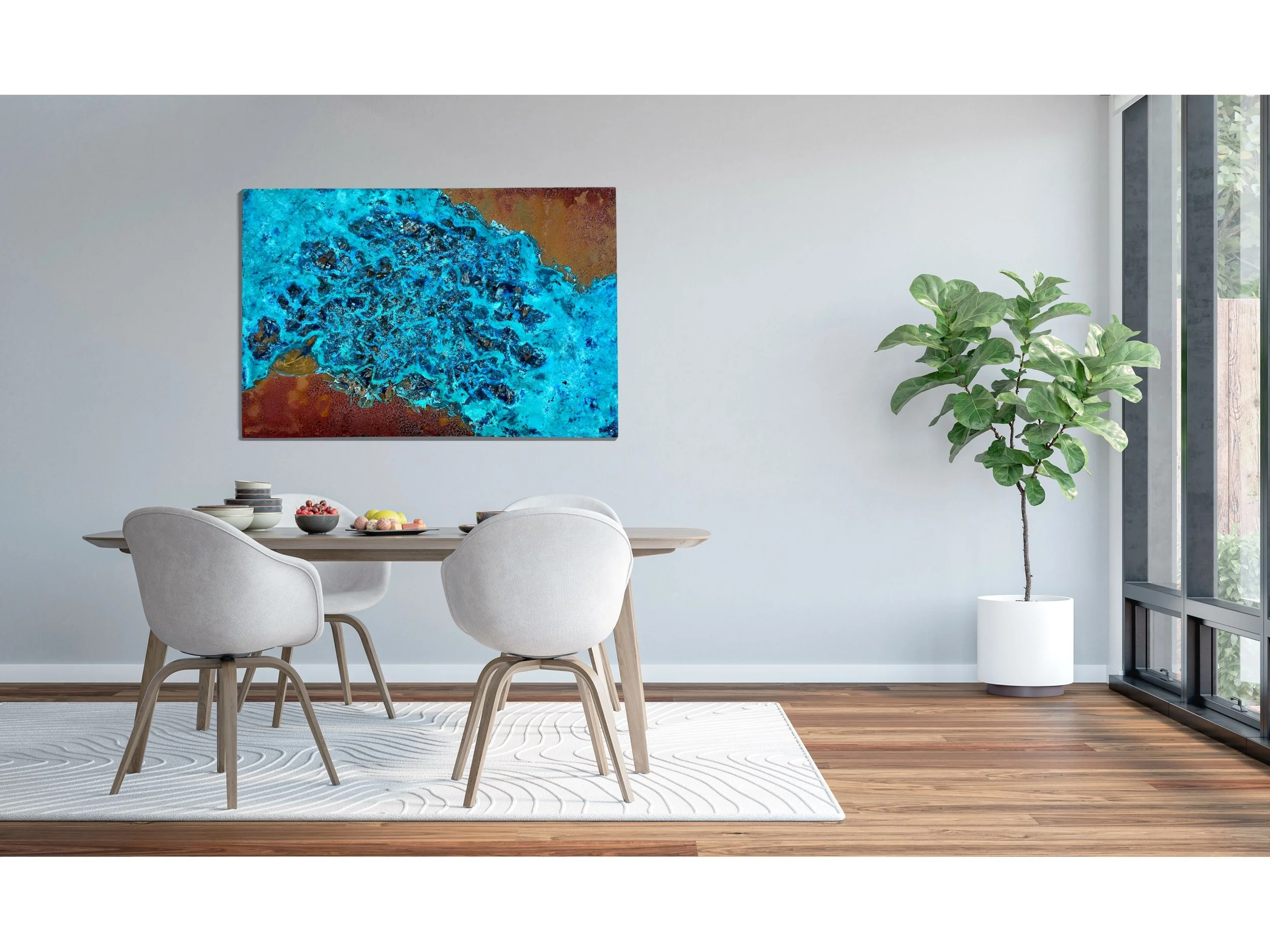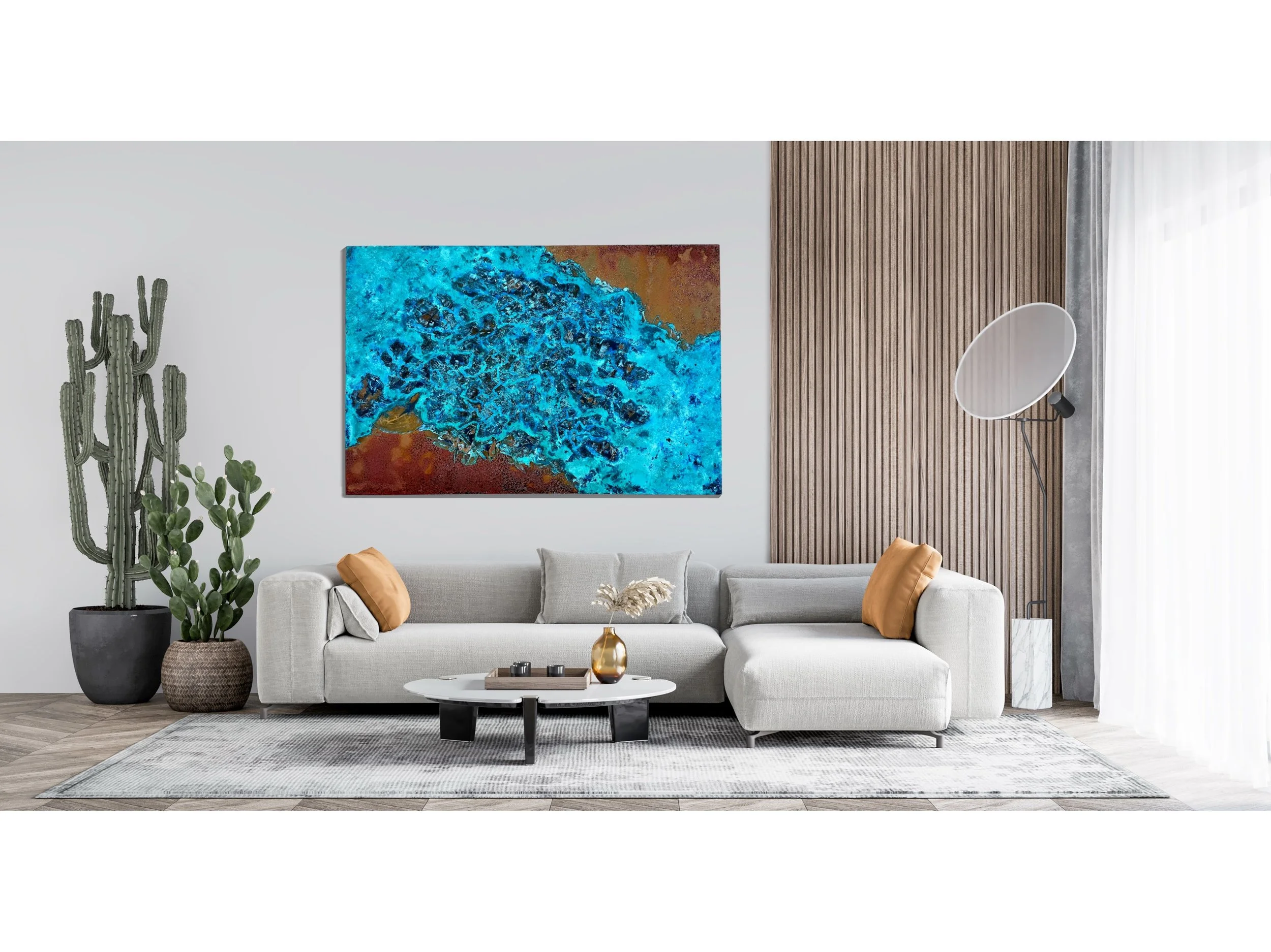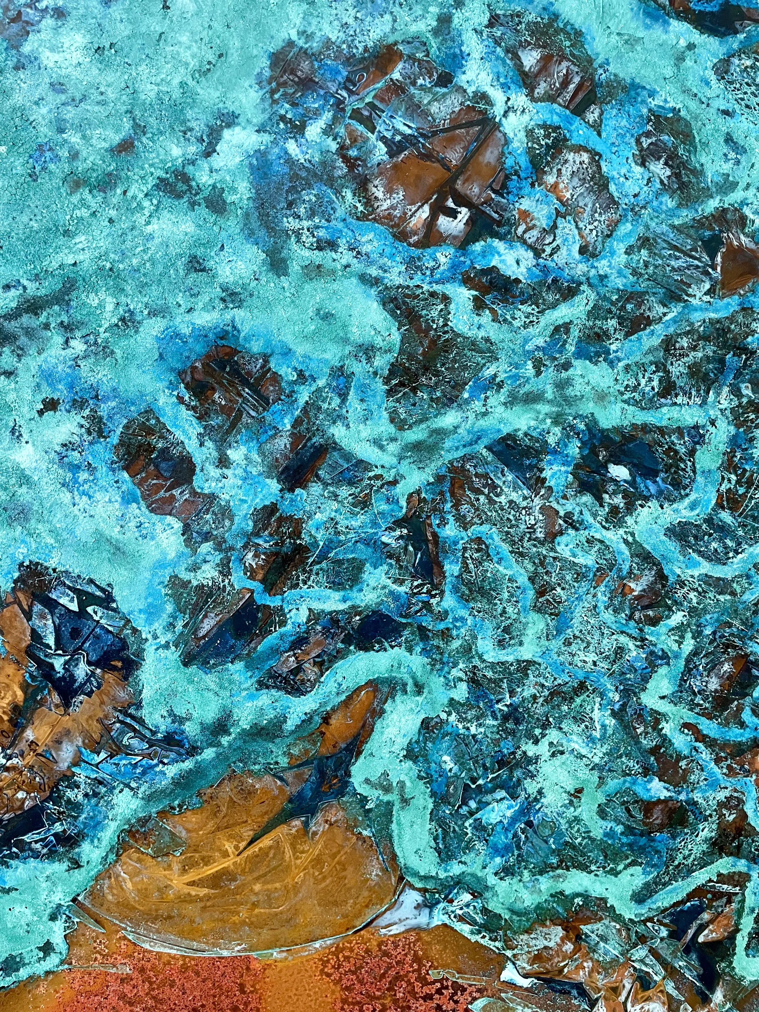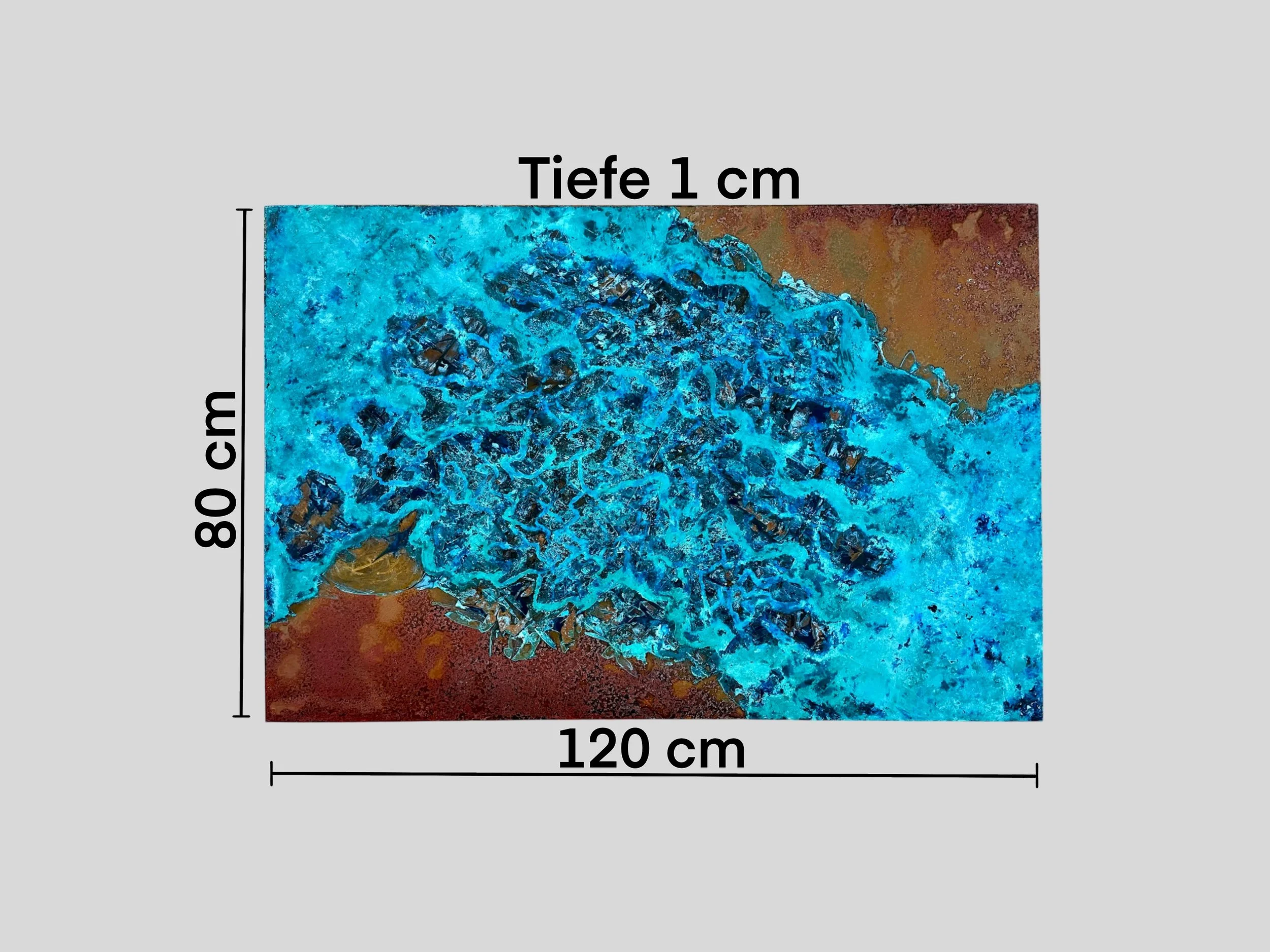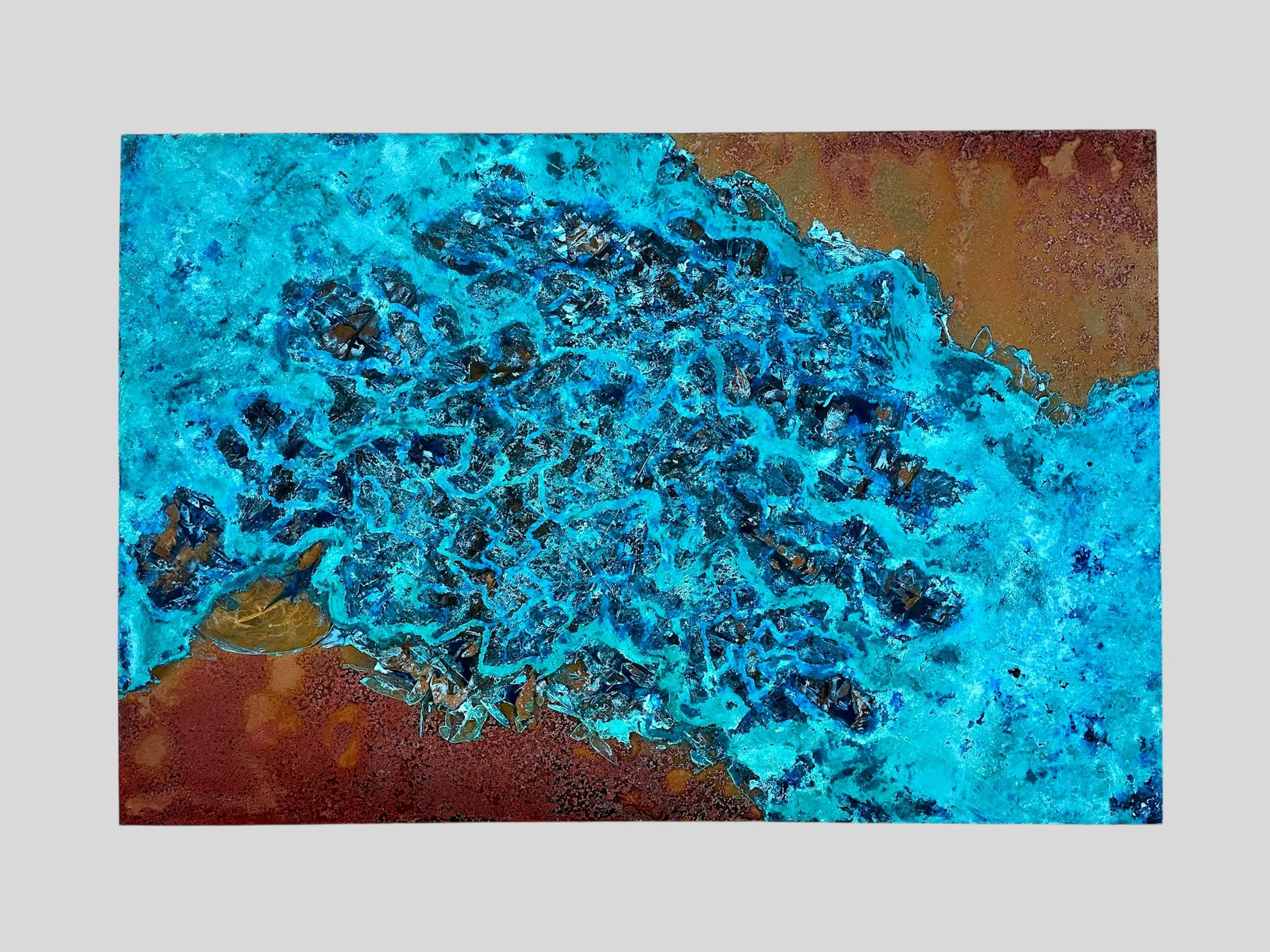 Die lebendigen Blautöne, kombiniert mit den erdigen Kupfernuancen, verleihen dem Kunstwerk eine faszinierende Textur und Tiefe. Diese harmonische Mischung von Farben und Materialien schafft ein eindrucksvolles visuelles Erlebnis, das die Magie und Geheimnisse der Unterwasserwelt widerspiegelt.